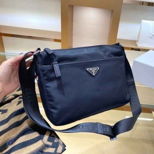 맞춤 조절형 우븐 나일론 테이프 숄더 스트랩이 제공되고 지퍼 클로저가 적용되었으며, 전면에 장식된 에나멜 메탈 트라이앵글 로고가 아이코닉한 감각을 더합니다.