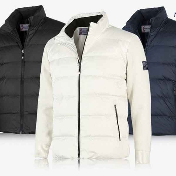 가로누빔 처리와 소매부분 니트소재를 레이어드한 몽X사의 클래식니트 패딩집업입니다