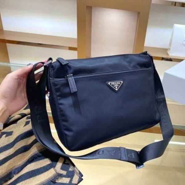 맞춤 조절형 우븐 나일론 테이프 숄더 스트랩이 제공되고 지퍼 클로저가 적용되었으며, 전면에 장식된 에나멜 메탈 트라이앵글 로고가 아이코닉한 감각을 더합니다.